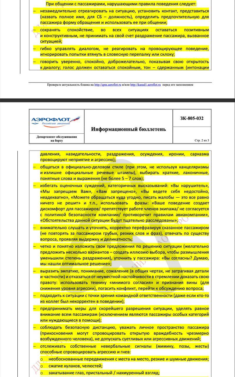 Её нацпер внёс в руководство для бортпроводников (БП) — в раздел по обеспечению авиабезопасности. В документе прописаны рекомендации и психологические приёмы, которые теперь должны использовать БП, чтобы сдержать или погасить конфликт.